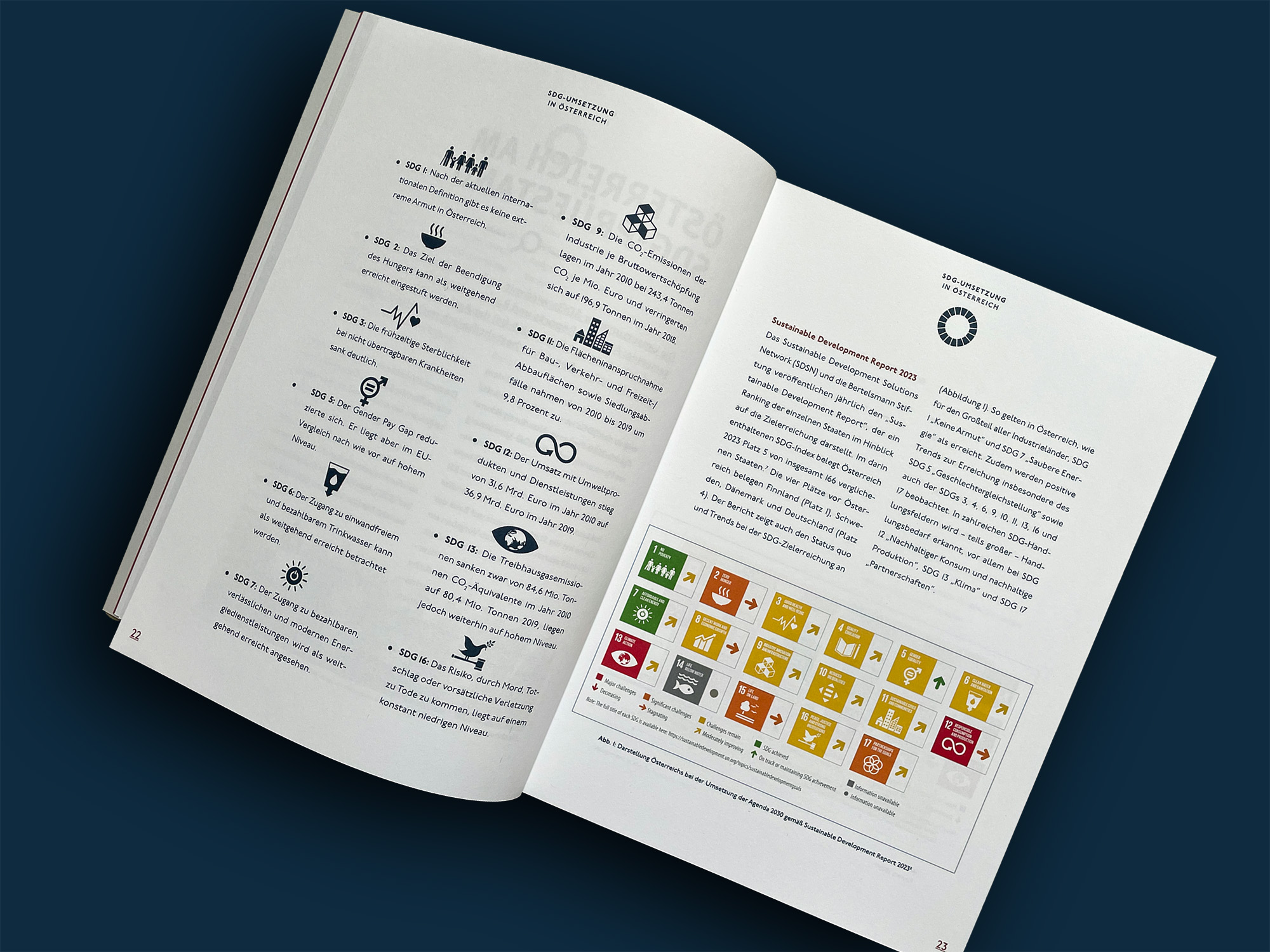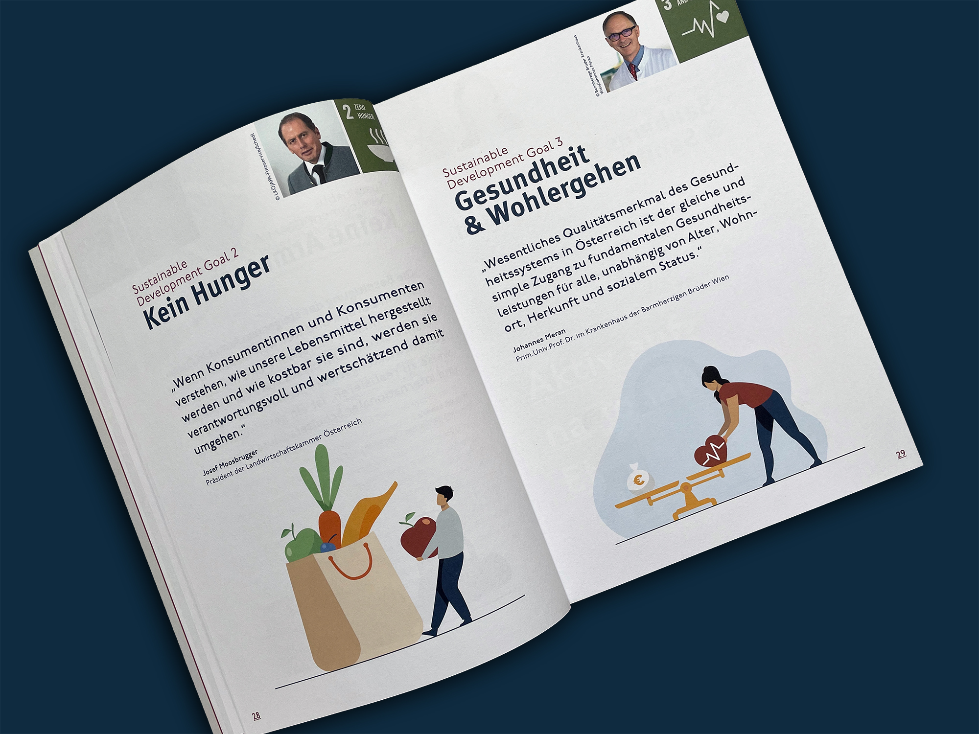 Concept and design of a comprehensive publication for the Ban Ki-Moon Center in Vienna on the topic of SDG goals and implementation in Austria.